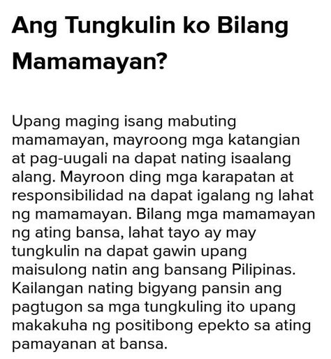 Mga kaibigan, bilang mamamayan tayo ay mayroong mga tungkulin at responsibilidad sa ating bayan. Hindi lamang ito basta-bastang pagiging Pilipino, kundi ang pagpapakita ng ating pagmamahal at pagrespeto sa ating bansa at kapwa Pilipino.